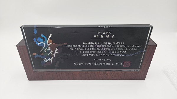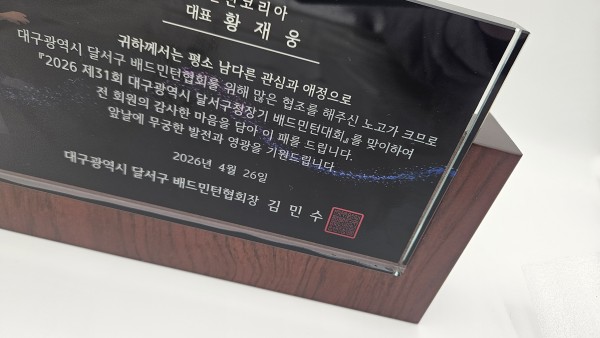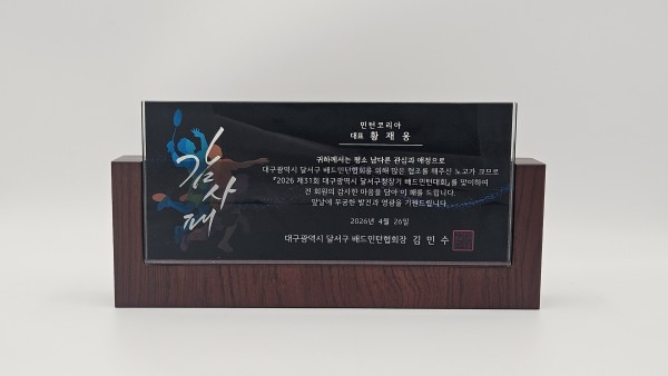 주문제작 제31회 대구광역시 달서구청장기 배드민턴대회 상패 페이지 정보 작성자 관리자 작성일26-04-04 10:48 조회11회 댓글0건 관련링크 이전글 다음글 목록 본문 이전글 다음글 목록